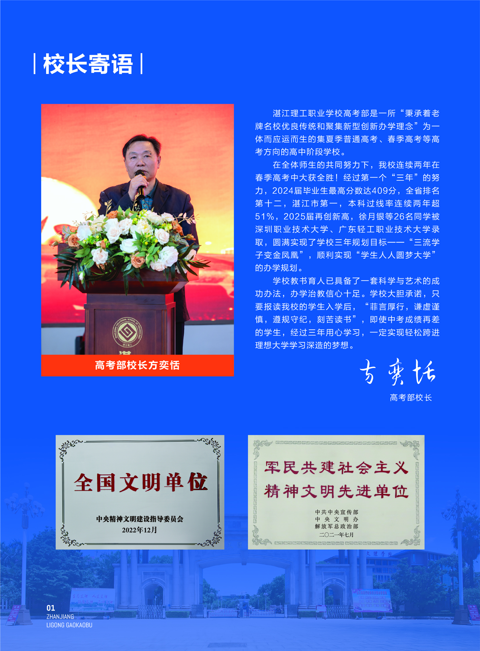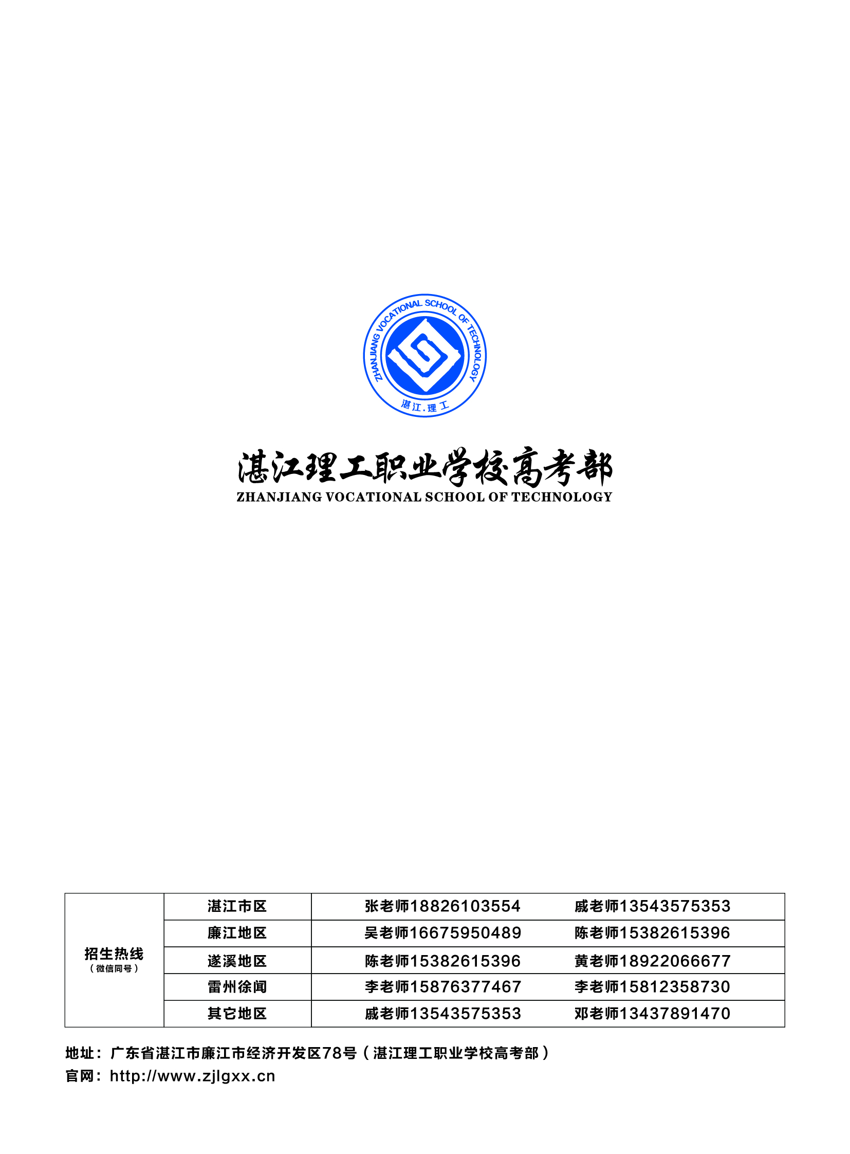 为响应国家号召,湛江理工职业学校高考部结合职普融通优势开设夏季普通高考班、春季高考本科班及春季高考公办班。高考部自办学以來,一直坚持“从严治校、质量立校、服务兴校、人才强校”的办学理念,力求“三周改变态度,三月改变习惯,三年改变人生”,以保障每一位学生考入理想大学。
