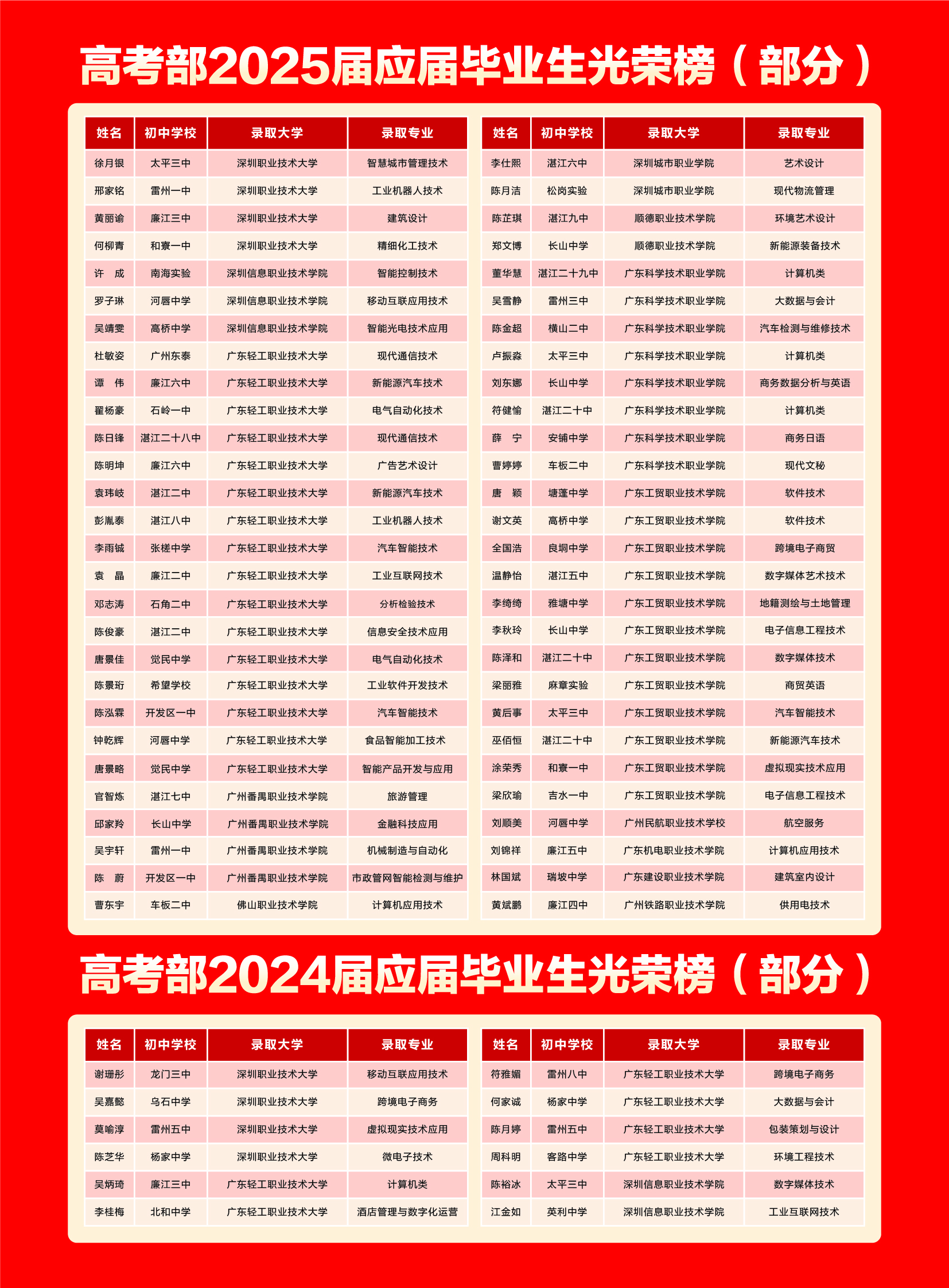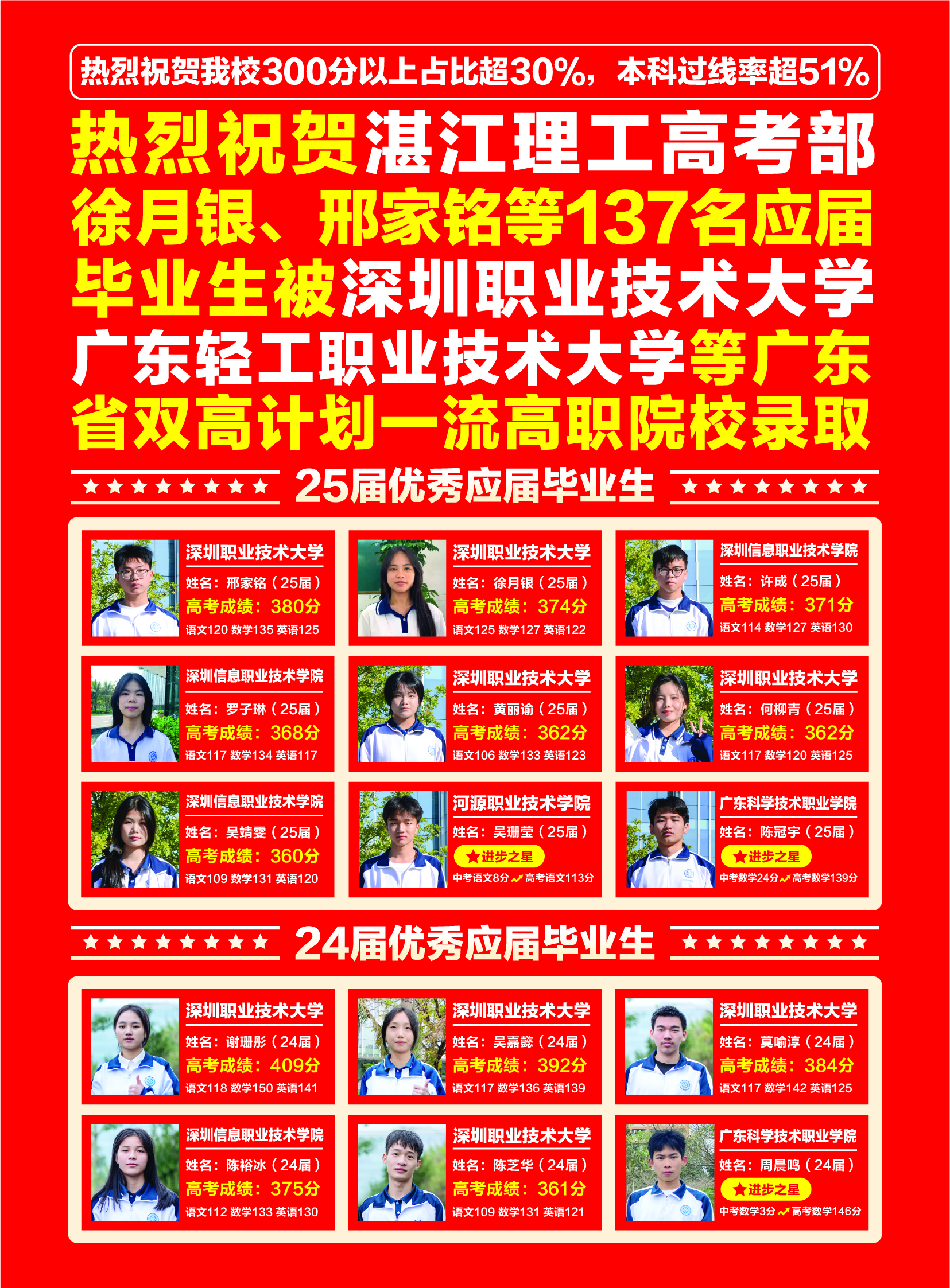 近年来,学校办学成绩突出,在2024、2025年连续两年在广东春季高考中大获全胜!2024届谢姗彤同学考取409分,位居广东省第十二、湛江第一!2025届徐月银、邢家铭等共计26名学生被深圳职业技术大学、广东轻工职业技术大学这两所国家级双高“小清北”大学录取;连续两年实现本科过线率51%以上,帮助学生实现从“无高中可读”到读全日制本科(专科)大学的华丽转变!