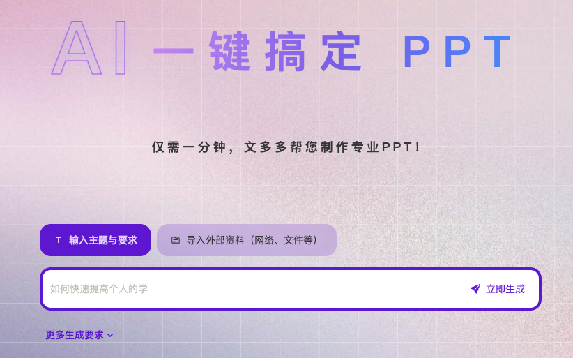只需一分钟,文多多就可以帮你做专业的PPT!,输入主题和要求即可生成!