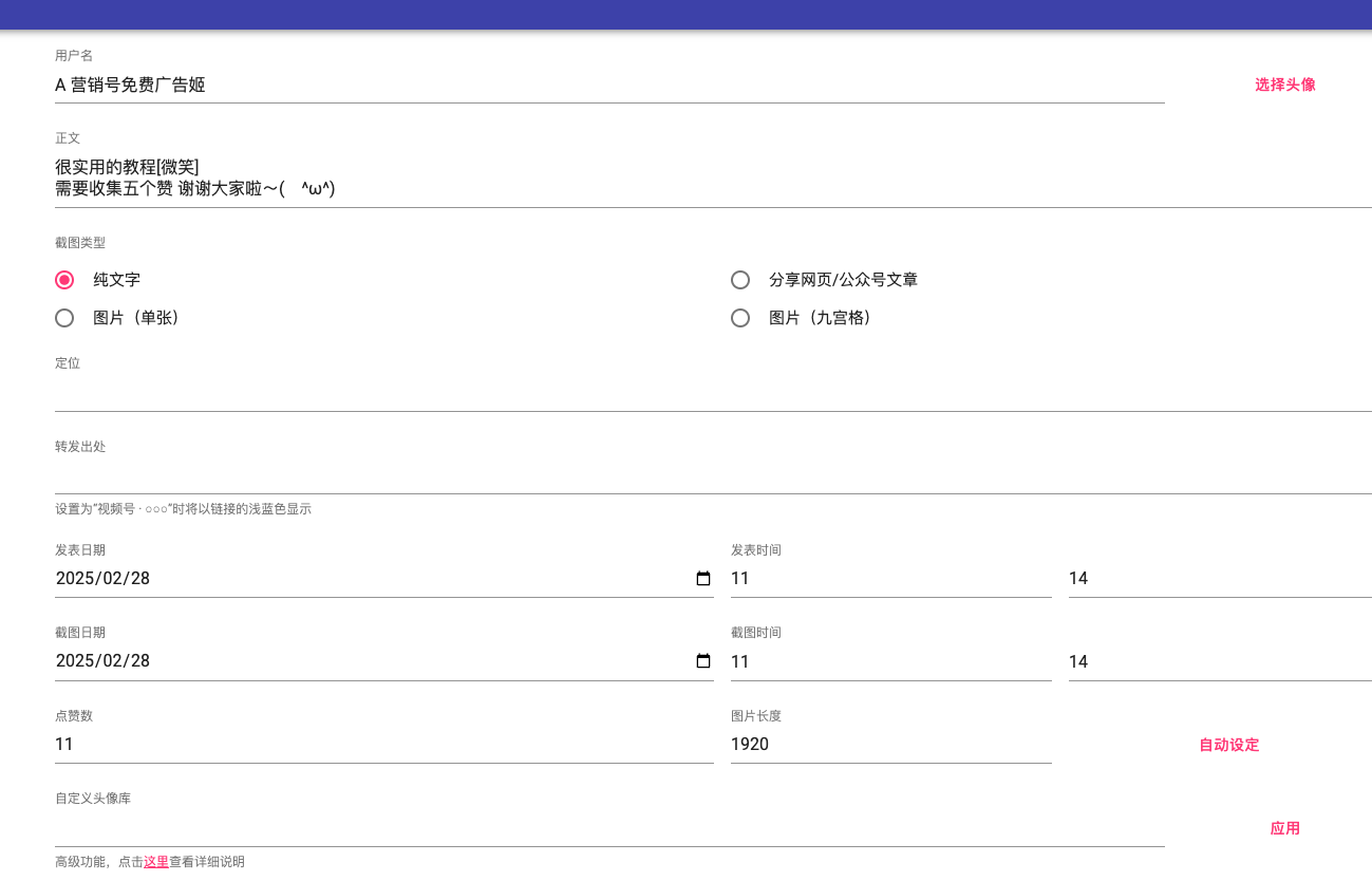 在生活和工作中,难免会遇到一些需要朋友圈赞美的事情。 如果你因为面子或者不想用自己的信用背书,可以考虑用这个朋友圈转发截图生成工具。 打开网页后,您需要一目了然地执行哪些操作。使用时,您需要定制用户名、头像、朋友圈内容、定位和时间,然后您可以自由发挥拇指数量和评论区域。