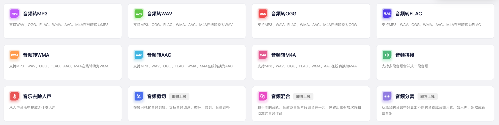 我们提供一站式免费在线音频处理平台,提供各种音频处理功能,包括音频格式转换、视频格式转换、音频视频转换、图片压缩等,以满足您所有音频文件处理的需要。