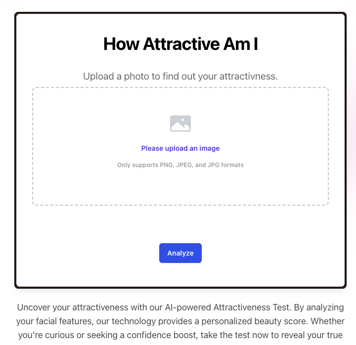 “How Attractive Am I——“面值测试器”是一种专注于面部吸引力深度分析的专业工具,旨在挖掘和呈现个体独特的魅力指数。只要用户上传个人照片,系统就会根据面部特征和比例准确计算出面值评分。