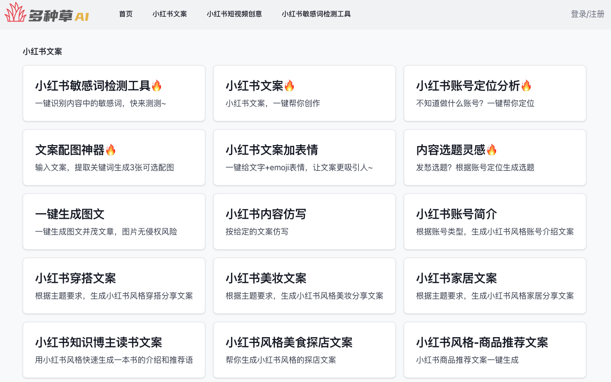 各种草人工智能是一种免费的在线小红皮书人工智能创作工具,它提供了一系列强大的功能,包括标题生成、草文案生成和商店视频制作,使用户可以轻松地创建高质量的小红皮书内容。