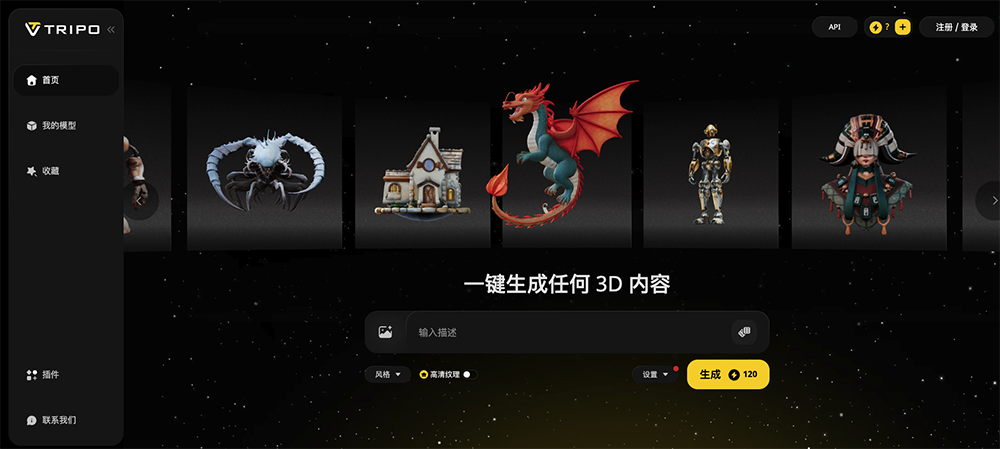 Tripo AI,由业内知名的VAST公司打造,是一个创新的在线3D建模平台。凭借文本或图像的输入,该平台可以在几秒钟内生成高质量、即用的3D模型,大大简化了3D模型的创建过程。对于用户来说,他们不需要专业的建模技能或依赖复杂的软件工具。