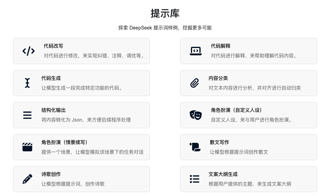 借助巧妙的提示设计,用户可以有效地指导DeepSeek的人工智能模型执行各种任务,包括文本生成、内容总结、问题回答和代码编码。官方提供的提示词库广泛涵盖了许多垂直行业的高质量提示词示例,为用户快速掌握应用技能提供了极大的便利。