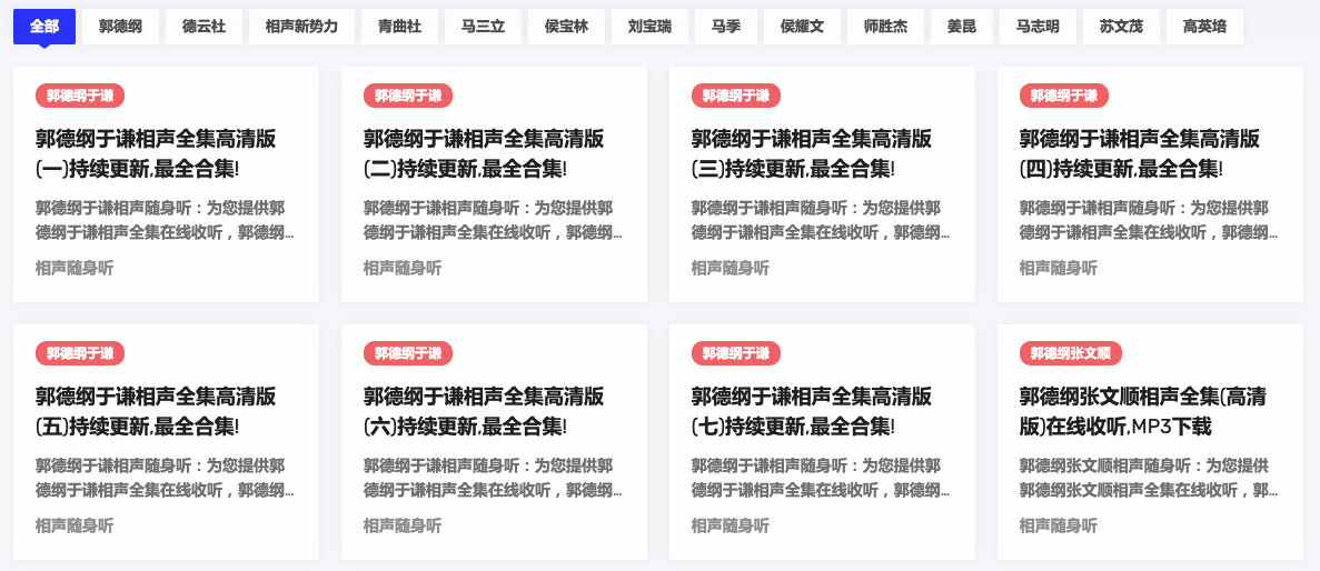 随身听相声网,一个汇集相声和评书资源的网站。在这里,您可以免费听全集相声,品尝全集相声,轻松下载mp3格式的相声音频。在这里,您将听到德云社、郭德纲、于谦、马三立、侯宝林、刘宝瑞、马志明、马季、侯耀文、石胜杰、姜昆、相声新势力、青曲社等精选作品。经典相声一网打尽,传统艺术发扬光大!让我们一起品味这种文化的盛宴,感受艺术的魅力。