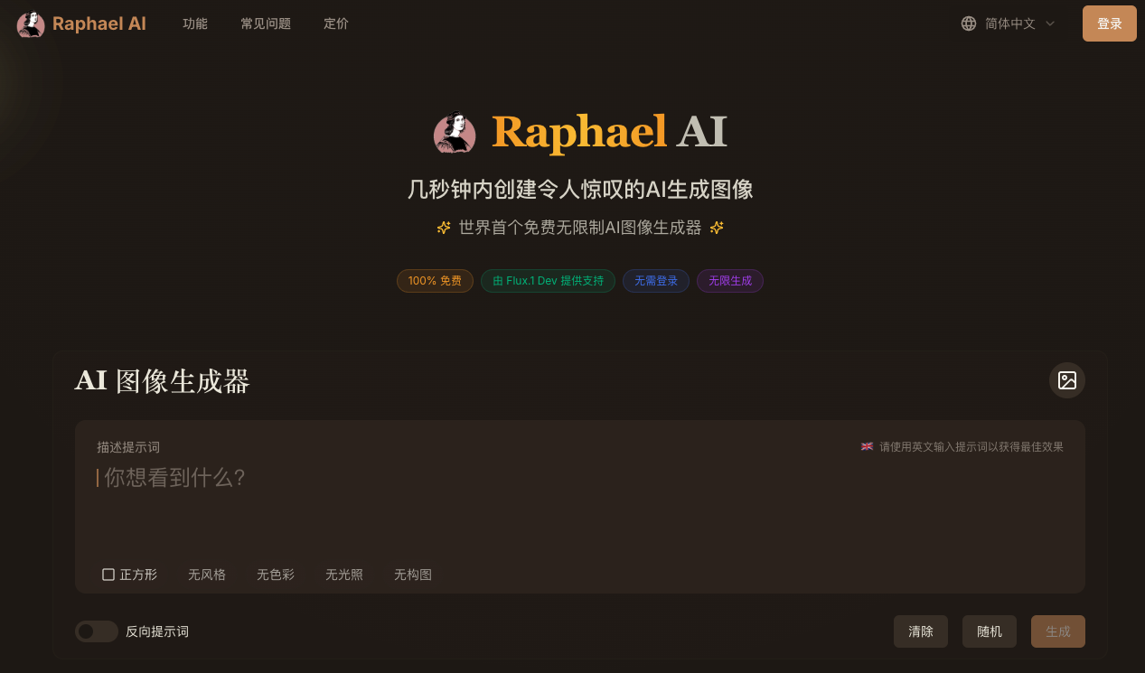 一个完全免费和无限的 AI 图像生成器,它让你不用登录,只需轻松打开即可使用。该生成器采用尖端 FLUX.1-Dev 该模型能产生高质量的图像,无论是哪种类型的图像,都能轻松应对。使用此图像生成器,您可以轻松创建各种独特的图像,无论是艺术创作还是工作需要,它都能满足您的需要。而且,它是完全免费的,不需要任何付费,是你创造力的得力助手。