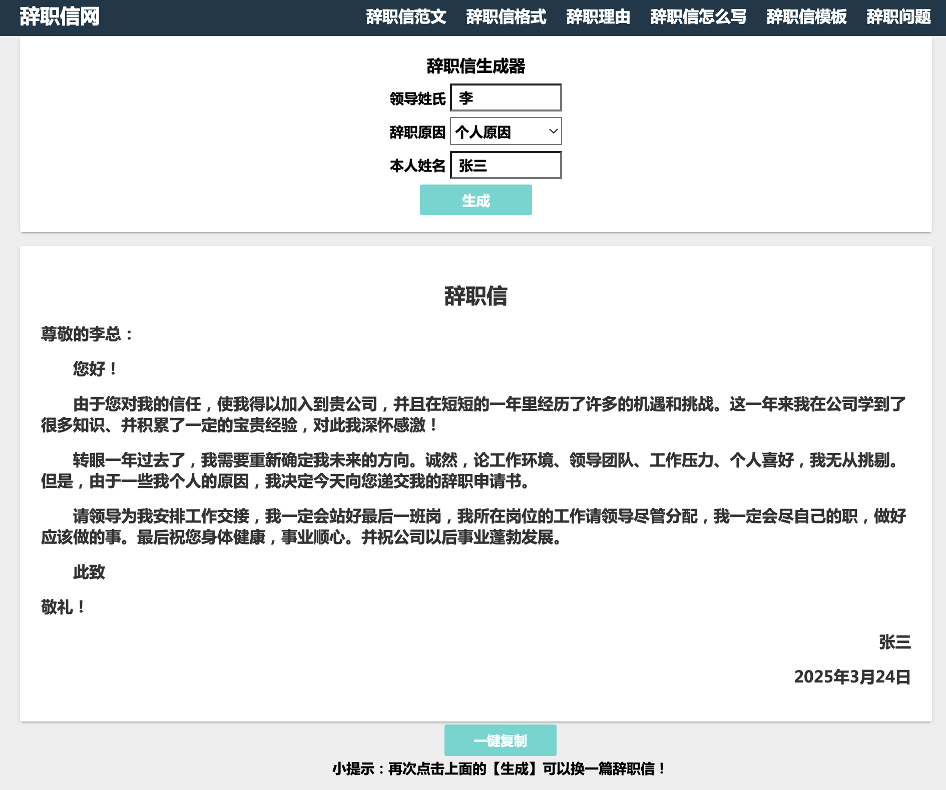 一个专为撰写辞职信而设计的在线平台可以有效地帮助您创建一封符合礼仪的辞职信。您只需输入领导的姓氏,解释辞职的具体原因和姓名,平台即可立即生成标准格式的辞职信。
