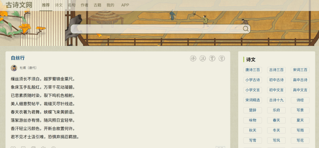 秦到现代的几十万首诗和古文,几乎所有著名的文章和大师,都在这里,包括你想到的和你想不到的。作品配备注释、白话翻译、创作背景介绍和著名大师欣赏。可以根据作者、朝代、体裁搜索,也可以根据内容和形象搜索,输入“月亮”,找到所有相关诗歌。良心网站,界面极其干净,没有广告。