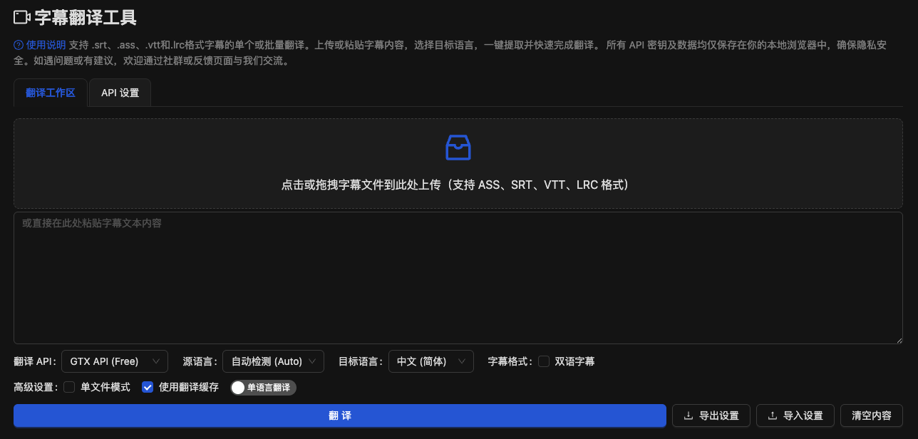 Subtitle Translator是专门为字幕翻译量身定制的免费开源工具,其强大之处在于支持多种字幕格式,包括.srt、.ass、.vtt等。该工具具有快速翻译速度和自动格式匹配能力,可以快速将字幕文件翻译成35种不同的语言。此外,它还支持满足国际需求的多语言翻译。该工具集成了各种翻译界面和人工智能模型,实现了有效的字幕翻译,为用户提供了方便、准确、快速的翻译服务。