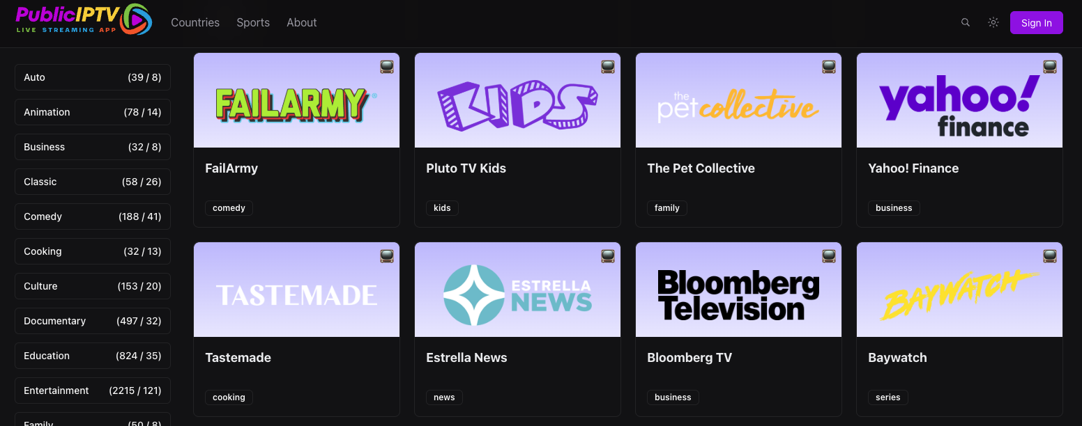 Public IPTV是一个在线IPTV频道导航站,汇集了来自世界各地的247个国家,分为28个分类的1.5万多个频道资源。该平台为用户提供了直观的分类和多种源播放选项,无需注册账号即可直接在线观看高质量的电视节目。该平台采用先进的M3U8 HTTP实时流媒体技术,播放流畅,涵盖新闻、体育、娱乐等内容。